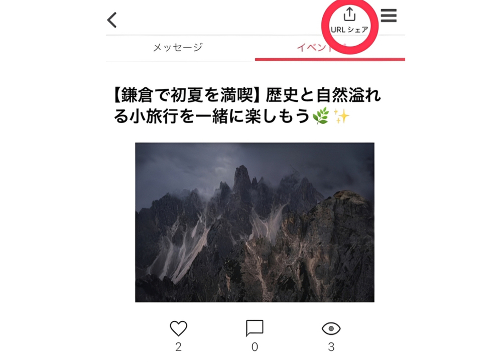 つなげーとへログイン後>ご自身が管理するイベントページを開く>イベントページ右上の「URLシェア」から自己集客URLをシェアできます。