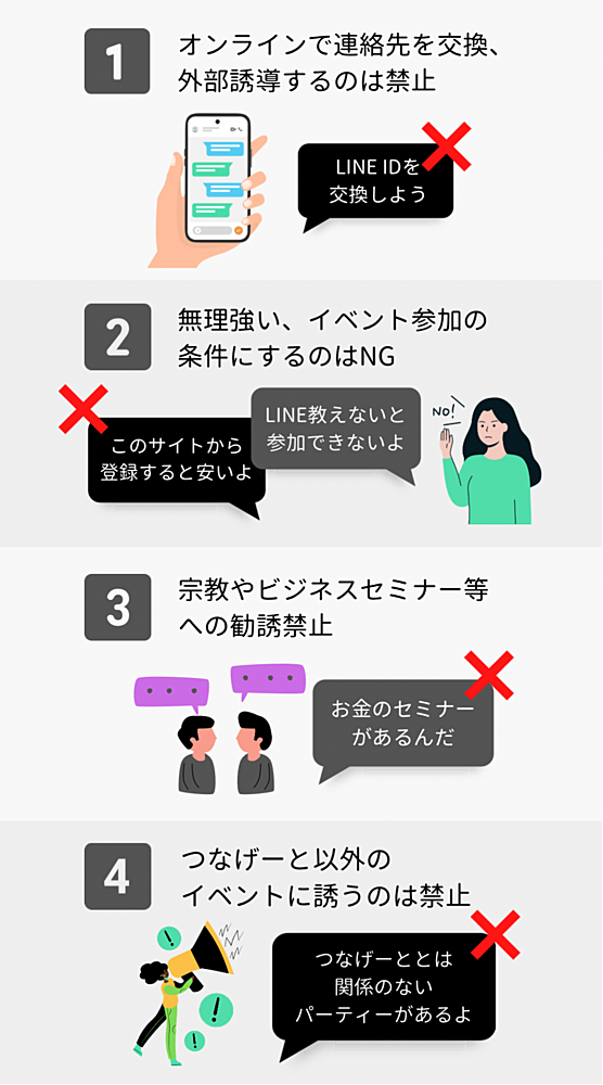 ・交換、取得した連絡先で、つなげーと以外のイベントや集まりへ誘うこと(イベントや集まりへのお誘いは、つなげーとのURLを介して行ってください。つなげーとは、イベントを全てチェックしており、あんしん・安全なものだけを表示しています)