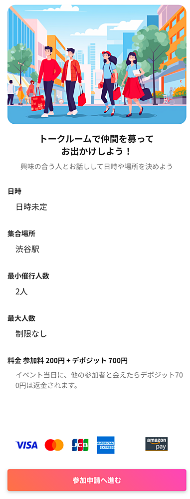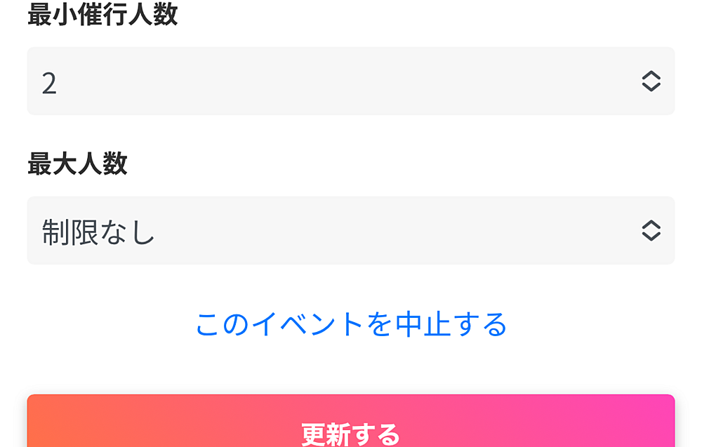 イベント開始時刻の3時間前までに、設定した最小催行人数に参加者が満たない場合、イベントは自動中止されます。