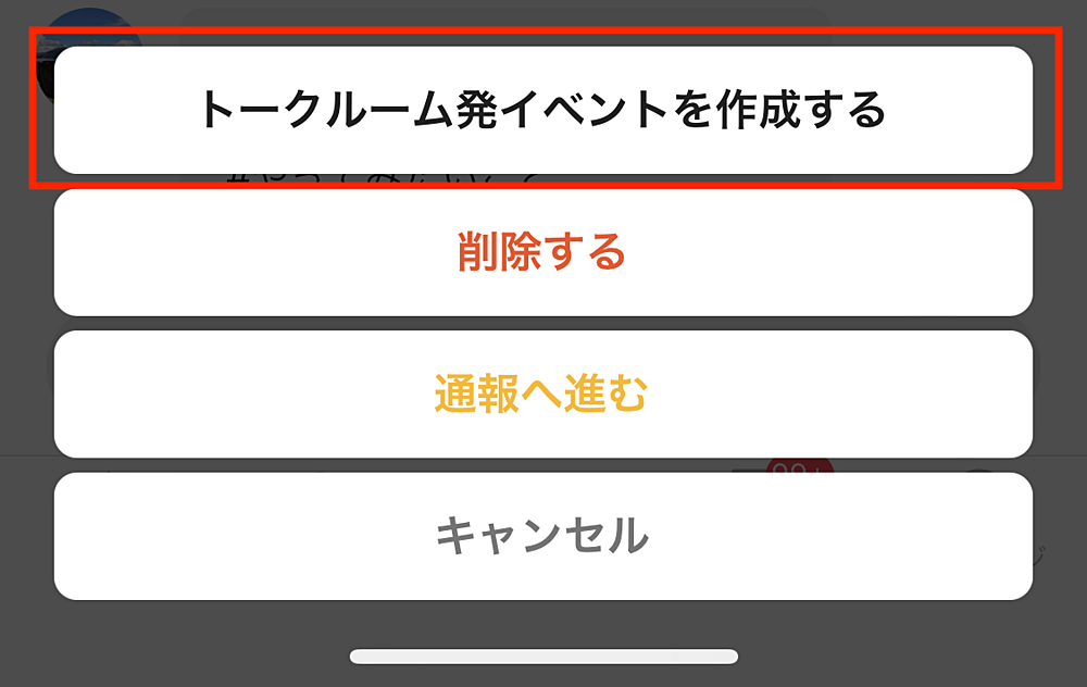 1. トークルームの右上にある3点メニューをタップするとメニューが表示されます。その中の「トークルーム発イベントを作成する」をタップします。