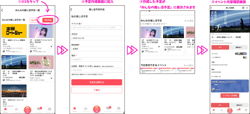 「みんなの推し活予定」では、推し活予定(推しのイベントや公演に行く予定など)を登録しておくことで、一緒に参加できるファン仲間を探すことができます。