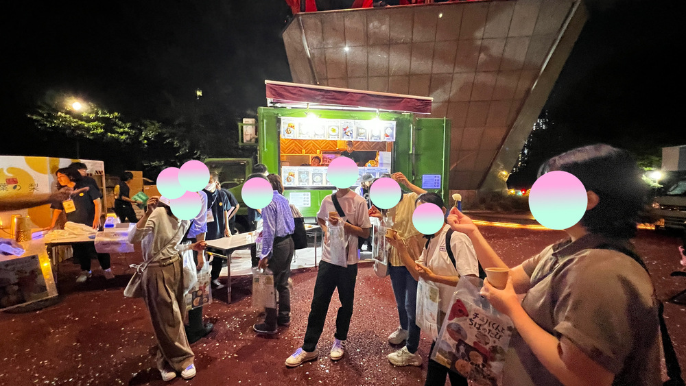 先着500名様に1Fのフードトラックで梨を配っているとの話