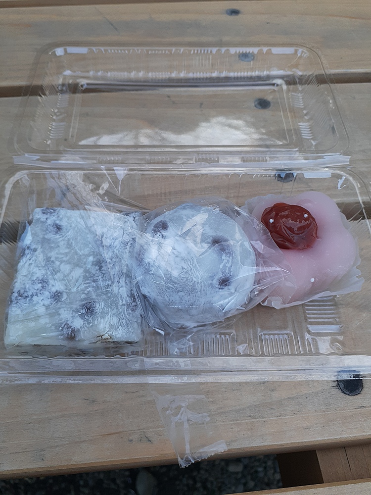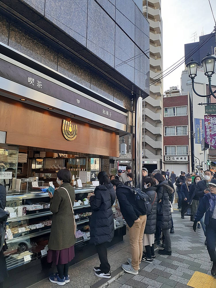 ⑥つる瀬(タベログ百名店の和菓子屋。先週より混んでいました。並んで、豆大福を中心に購入。企画者は写真のように、豆大福・豆餅・梅菓子を購入)