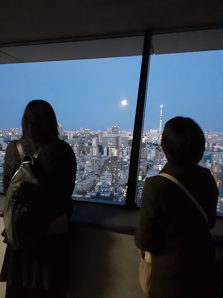⑨文京シビックタワー(地上100m以上の展望台へ。日も暮れ、夜景が見れました。東京スカイツリーとおぼろ月が見える景色や、最初の集合場所を上から見る景色は感動しましたね)