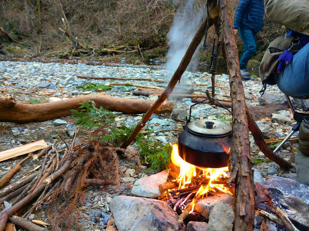 体験が終わったら、焚き火でお湯を沸かして、コーヒーを淹れて、感想を共有したりのんびりしています。木でできた三脚は"トライポット"といい、ブッシュクラフトの基本的な工作技術です。ケトルや鍋をつるしたり、絵にもなってカッコいいです。