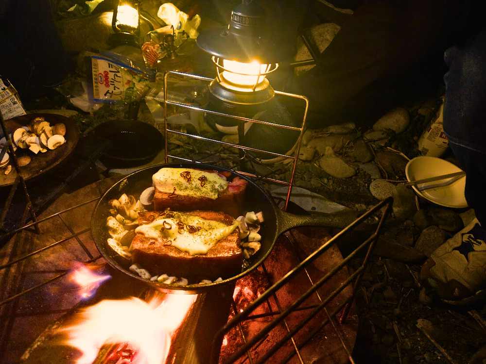 メインができるまでは、野菜、ウィンナーを焚火で炒めたものなど人数や日によって様々な軽食も。