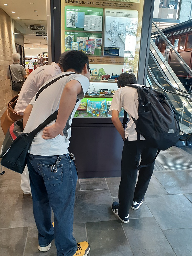 ④次に旧新橋駅停車場へ。暑いので新橋駅から地下を通って、行きました。当時の再現プラットホームに行き、入口へ。2Fで行われている鉄道と制服という展示では、この制服暑くないのかな?という話題になり、昔の人は我慢していたのかな?などのお話をしました。いつもより、人も多かったですね。