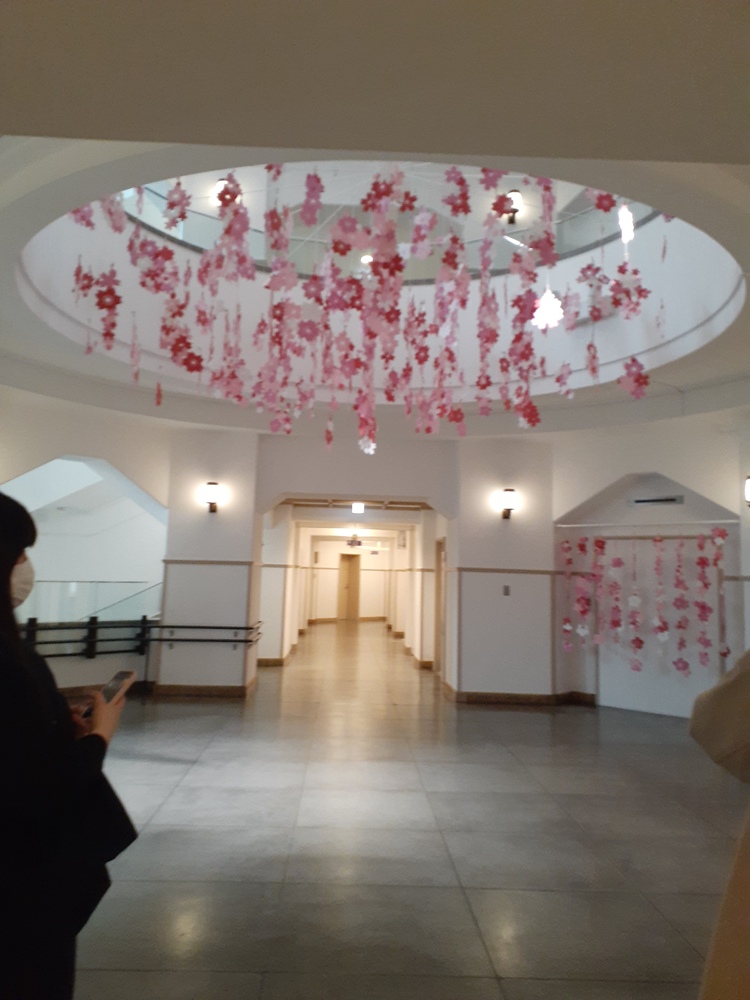 ↓4階ホールです。桜の季節にさいし、このような飾りもしているようです。