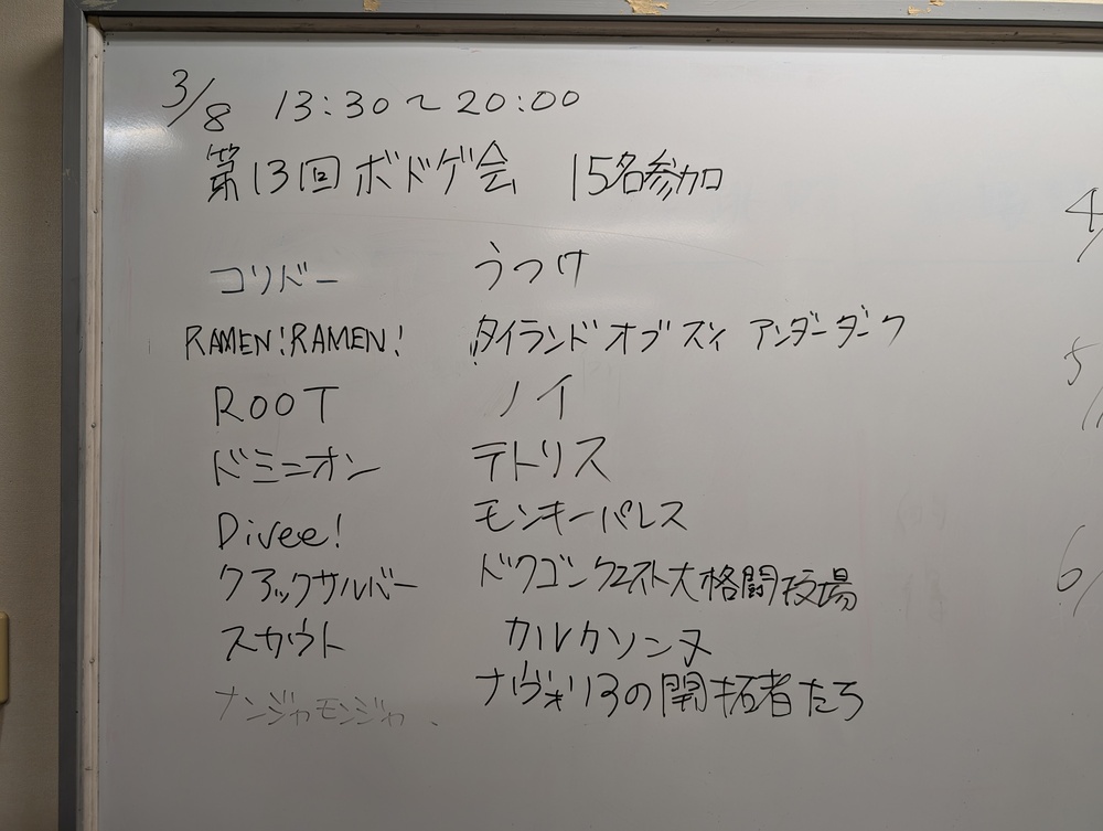 3/8 13:30~20:00(曇りのち雪)15名参加◆遊んだボードゲームコリドー街コロ通RAMEN!RAMEN!ROOTドミニオンDivee!クアックサルバーscoutナンジャモンジャうつけタイランドオブズィアンダーダークノイテトリスモンキーパレスドラゴンクエスト大格闘技場カルカソンヌメガラッキーボックスナヴォリアの開拓者たち