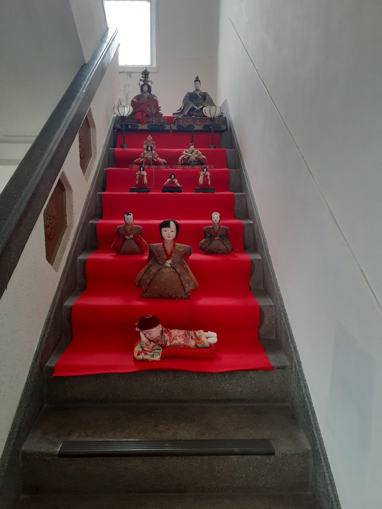 2F建ての建物ですが、階段にはひな人形が!さすが、人形の街。