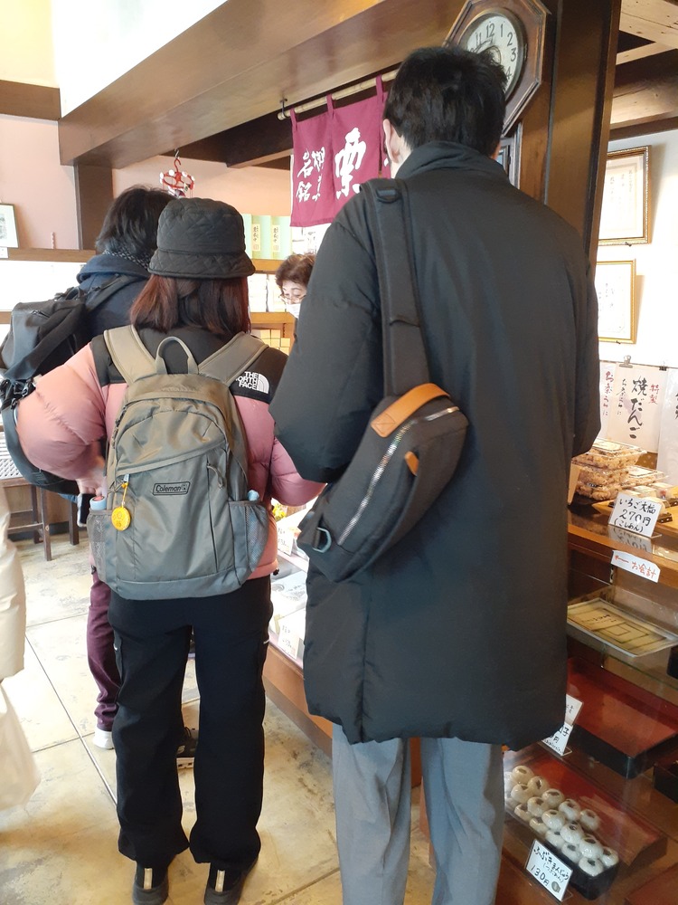 ↓市宿通りにある、嘉永(江戸時代後期です)に創業の和菓子屋です。看板製品の最中や季節製品の桜餅を皆で買って、食べました。