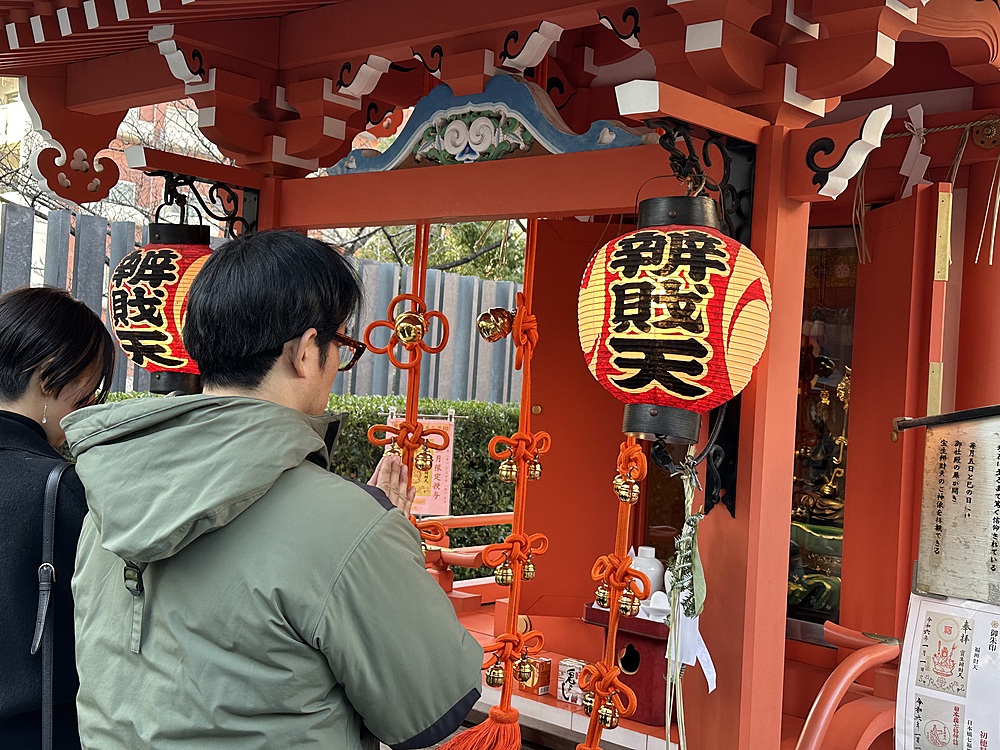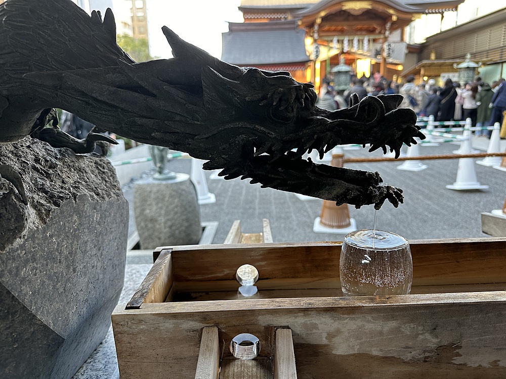水天宮境内の弁財天を参ります。手水に龍がいました。水天宮はとても手入れが行き届いていて、お供物も含めてリッチな印象を受けました。