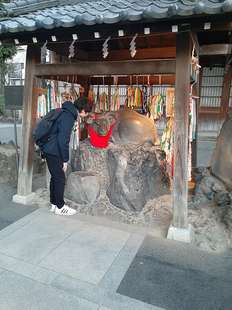 ↓有名な撫で牛を撫で、からだの悪い所が治るように願います。