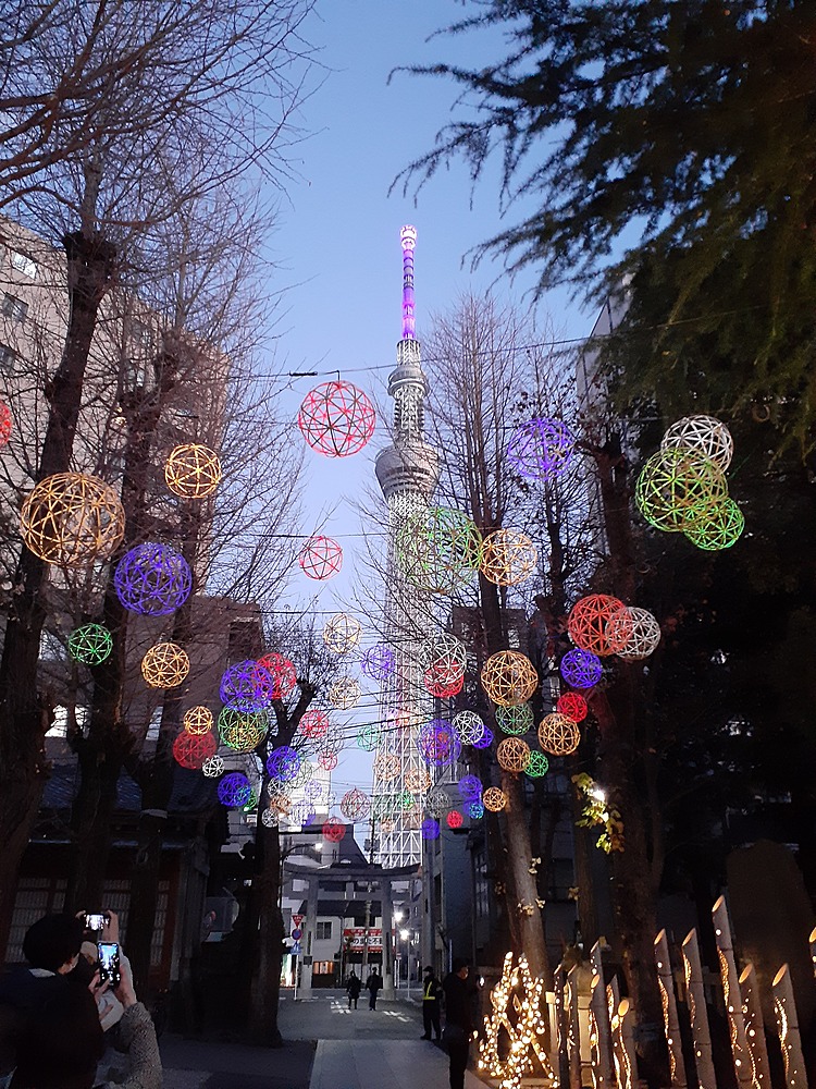 参加者の皆さんの希望もあり、牛嶋神社と間近に見えるスカイツリーのライトアップをまちました。待った甲斐がありましたね😃