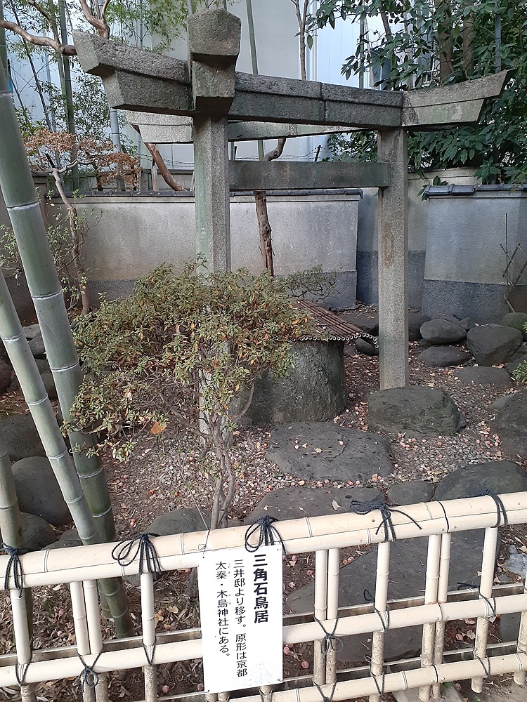 ↓三井家から移転された、三角石鳥居。非常に珍しい鳥居です