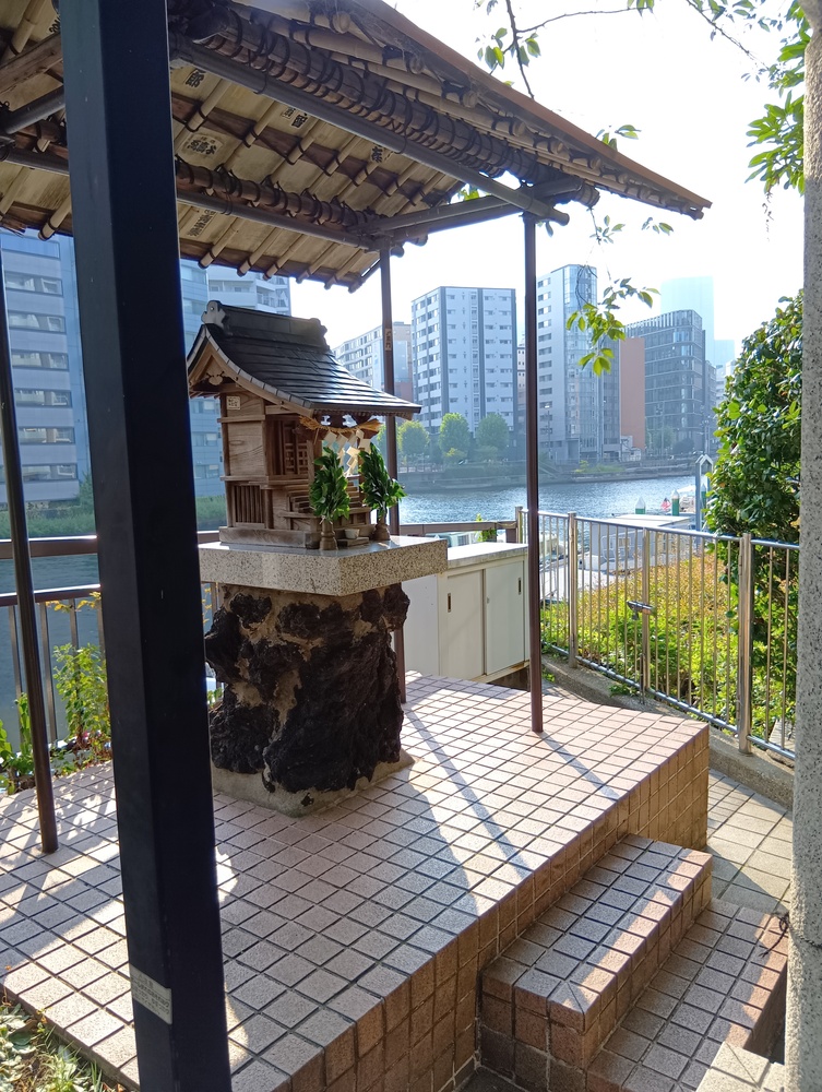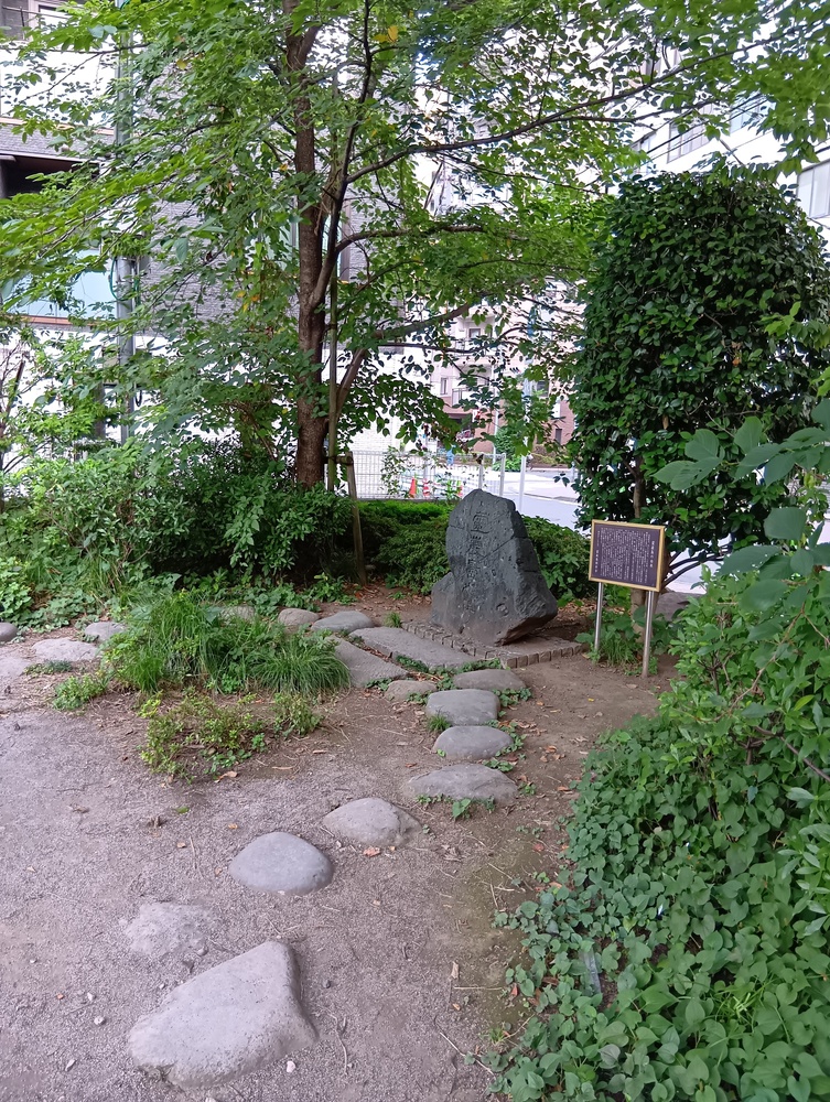 かつて新川が霊厳島と言われた頃をしのぶ、石碑です。別名こんにゃく島。今は島だなんて歩いても分からないですね。