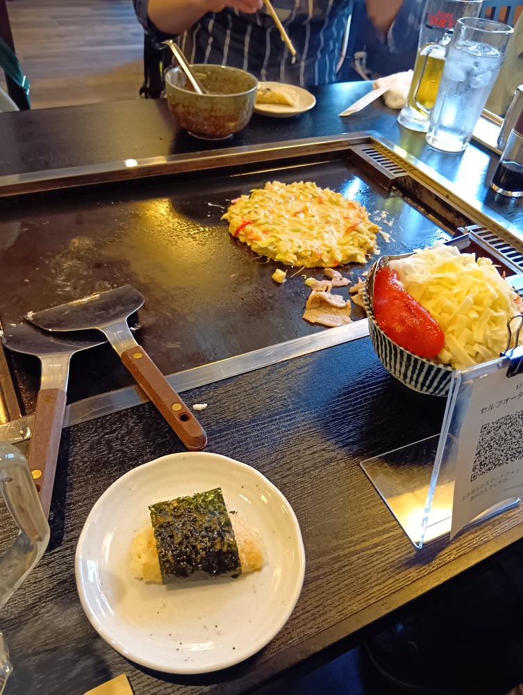 ↓右のお好み焼きや、左下の山芋の磯辺焼き、あと調理待ちのもんじゃが並んでいます🤤
