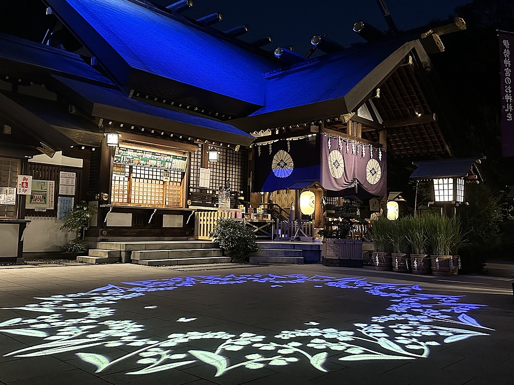ライトアップと鈴蘭と蝶をモチーフとしたライティングです。ゆっくり回っています。神社では初めてのタイプのライトイベントでした。