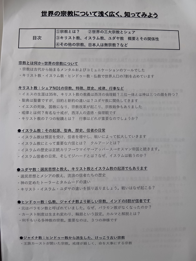 次回は2回目で同様の世界の宗教です。次回はどんな反応や感想をお聞きできるのか、楽しみです。