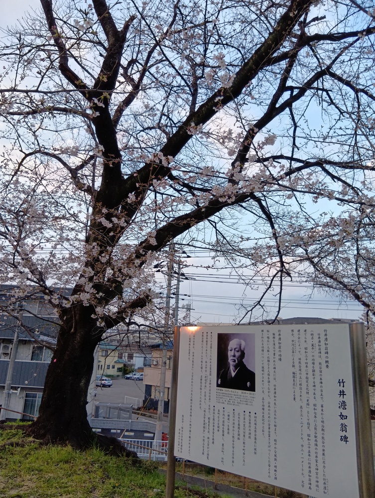 ↓桜の木を明治に植樹したのは、明治の偉人 タケイタンジョだそうです。彼の資料看板の前の桜が咲いていました。