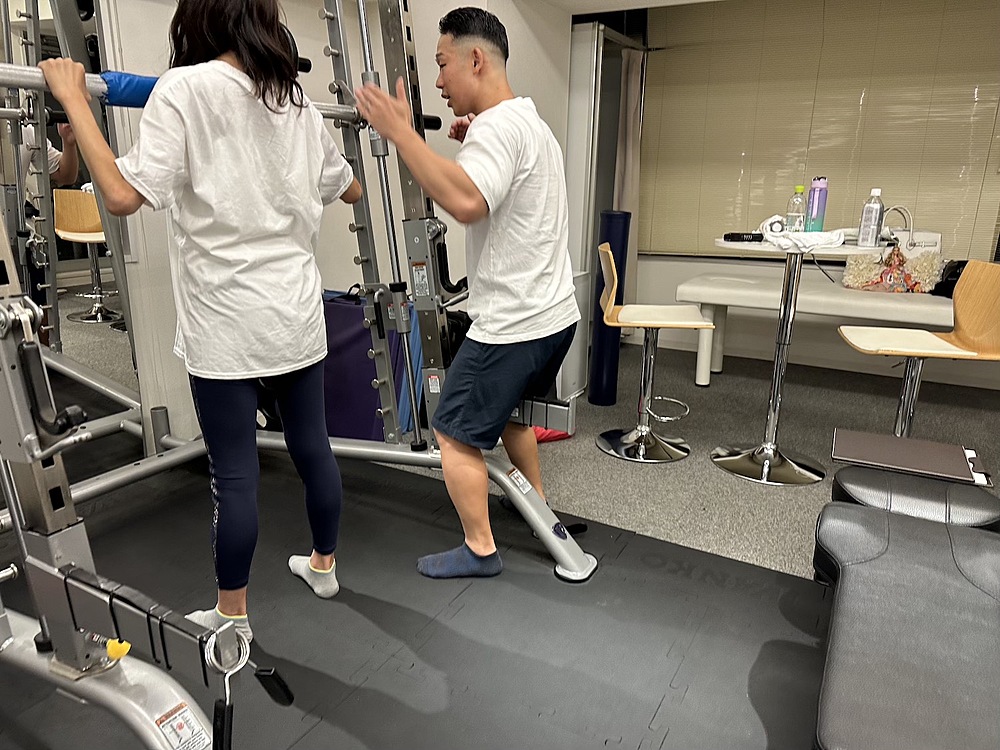 先生に見本を見せてもらい、一人一人アドバイスをもらいながら器具を使って筋トレしました。自分の番でない時はスクワットやストレッチをしながら他の参加者がやっている様子を見ていました。フォームを指摘してもらえるのはすごく嬉しいですね。そのフォームだとここに筋肉がつくなど具体的でした。