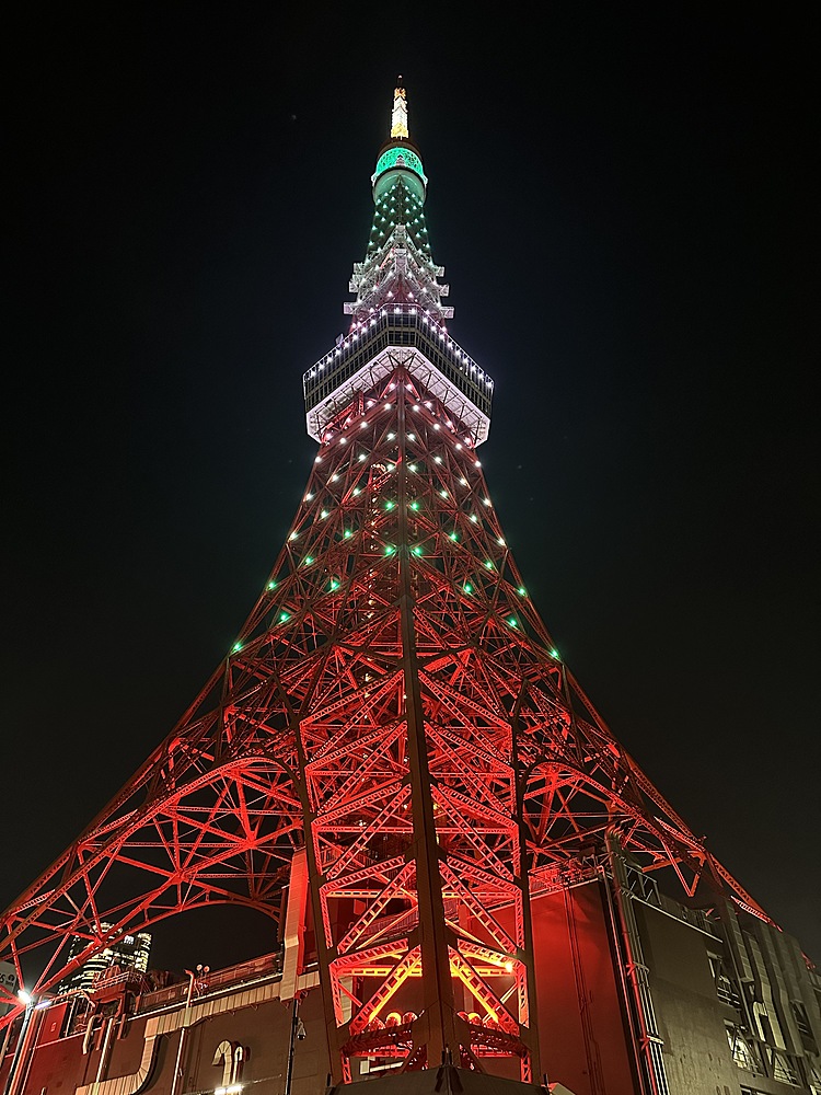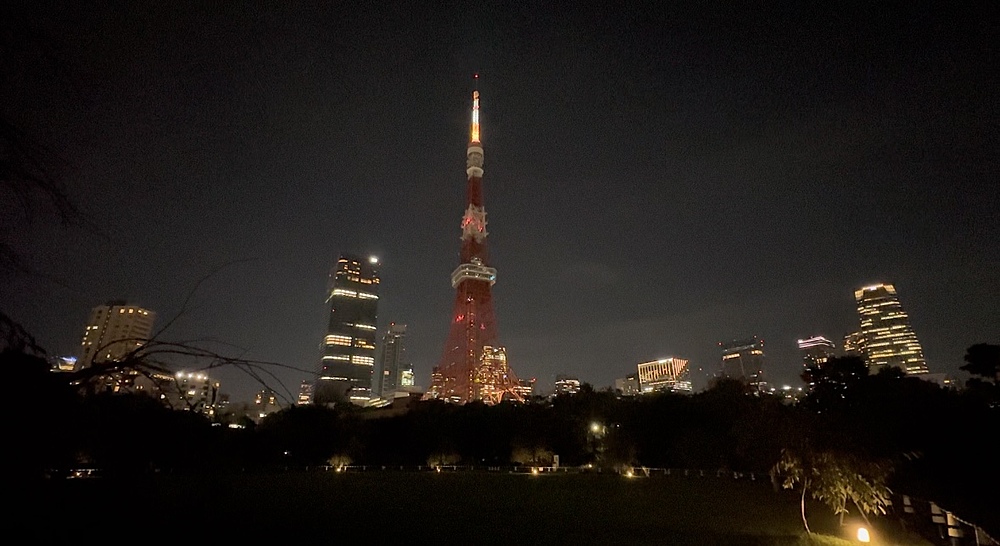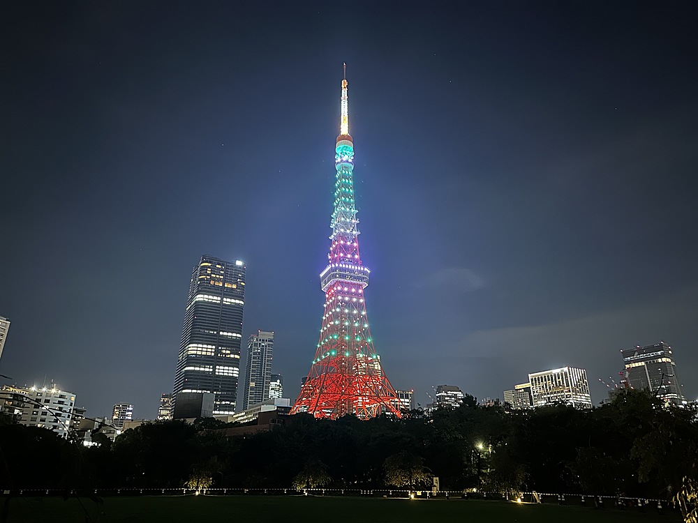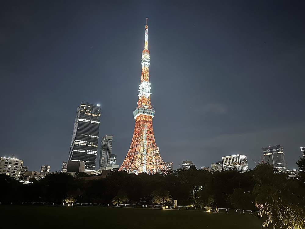 東京タワーは20:00にライトアップが切り替わります。そのタイミングに集合して芝公園から見上げました。他にもたくさんの方が公園にレジャーシートを敷いてくつろぎながらライトアップを見ていました。