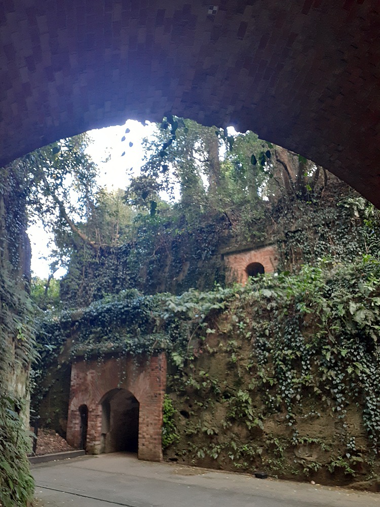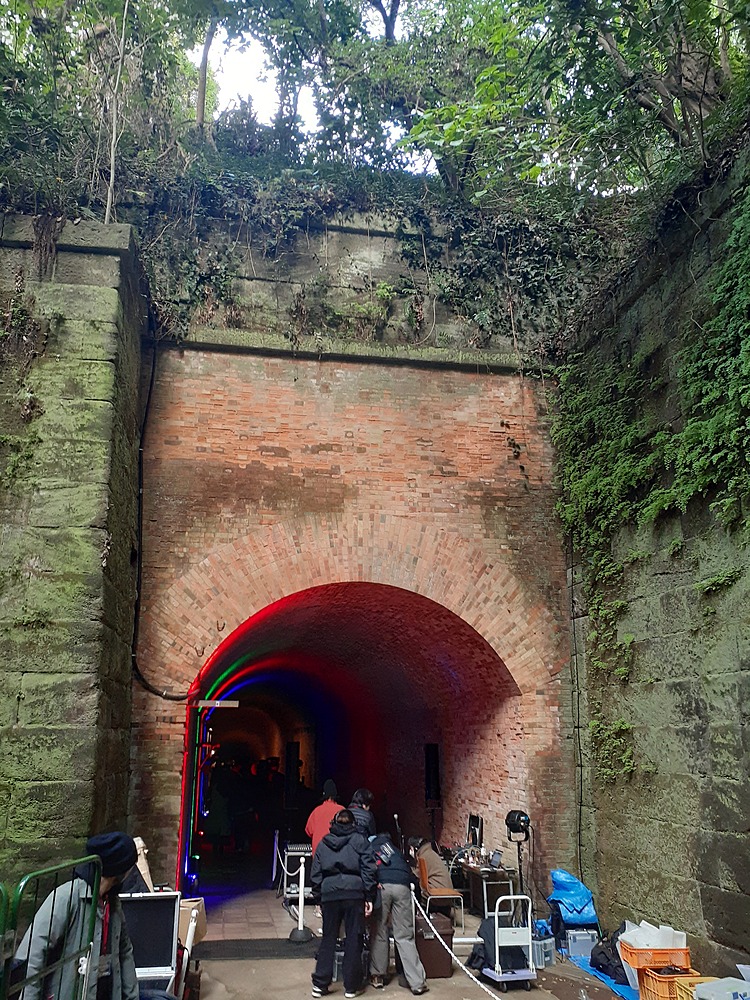 猿島は小さなトンネルも多く、非日常感があります。いつもと違ったのは、音楽イベントがあるようで、その準備をしているようです。
