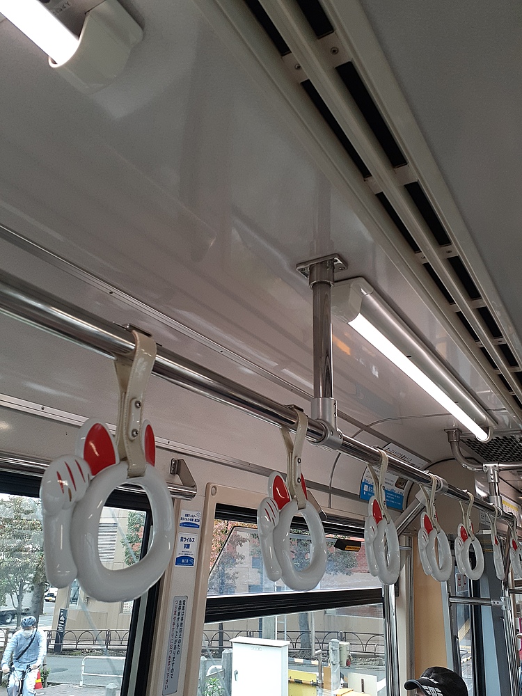 ⑤かつての江ノ電車両を疑似乗車:宮坂駅には玉川線→江ノ電で利用された車両に疑似乗車できました。昔の車両雰囲気やつり革、椅子に当時の雰囲気を味わいました。