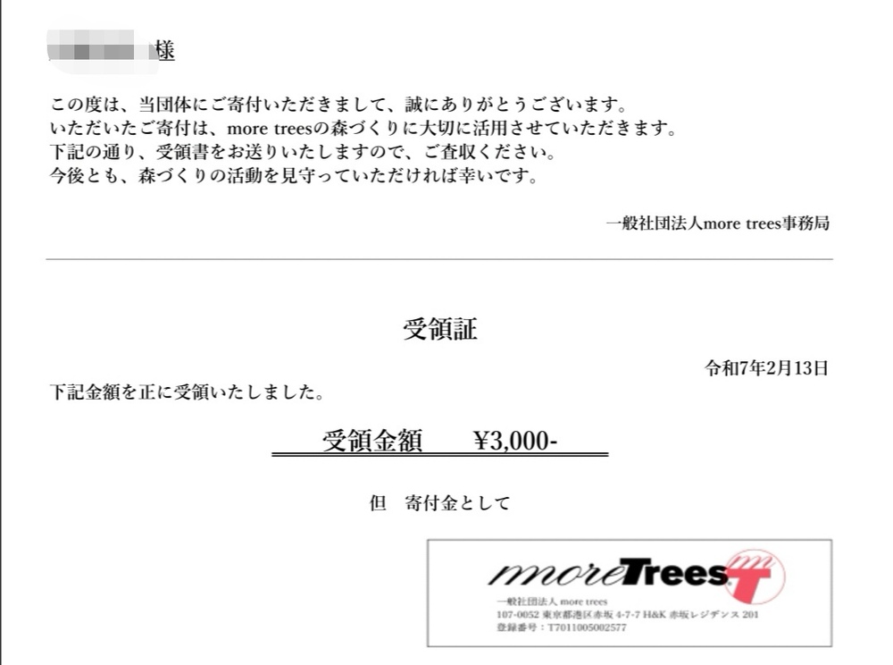 また、森林保全支援とし一般社団法人more treesさんにもわずかではありますが、寄付させて頂きました。1000円で1本の木を植えることができるということであったので、3000円寄付し3本の木を植えてもらい少しでも環境保全の力になればということで、決定しました。