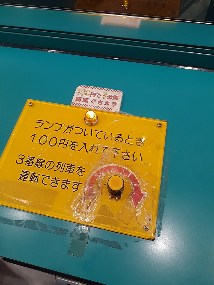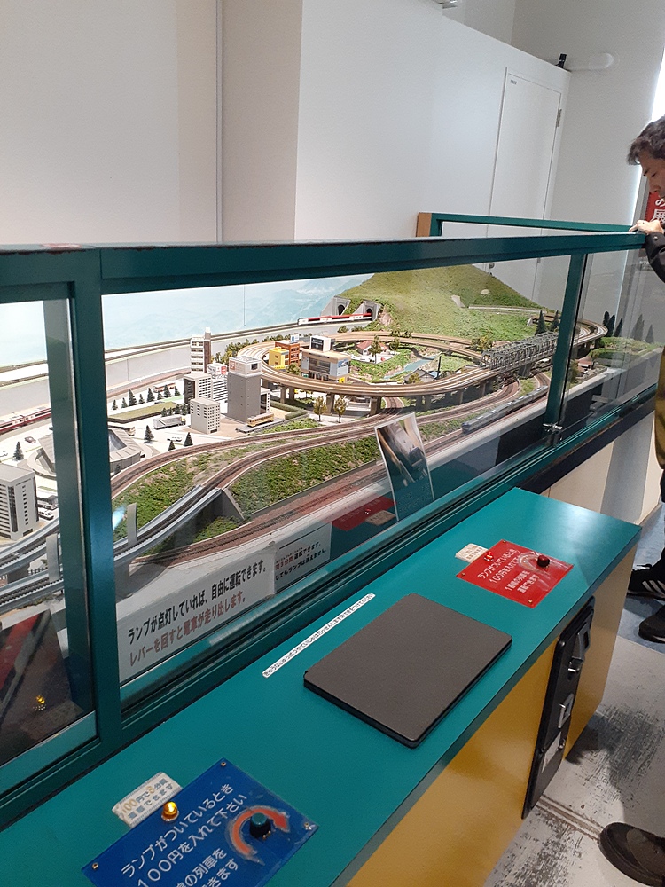 ジオラマの前で電車を走らせましたが、なんと有料!仕方なく、100円入れて3分楽しむことに😃