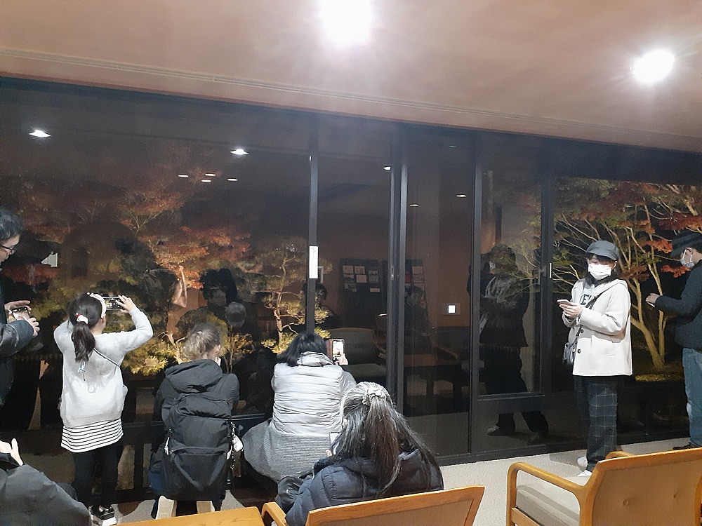 少し時間が経つと、あたりは真っ暗に。17時になったばかりなのにですよ。記念館からガラスごしに、紅葉の木々を撮りました