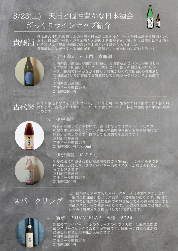 8/23(土)天蛙と個性豊かな日本酒会 ざっくりラインナップ紹介