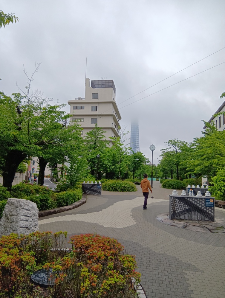↓画像は山谷堀公園から隅田川方向に見た画像です。雲がかっているのはスカイツリーです。