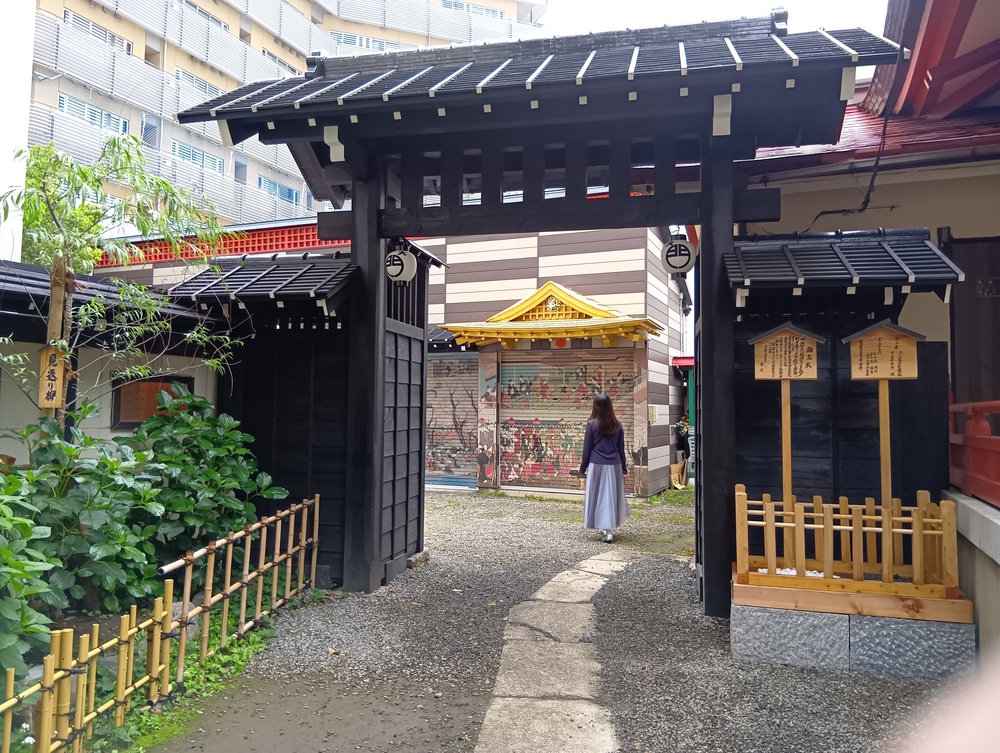 ↑かつての吉原大門を再現したスポットが、吉原神社奥にあります。