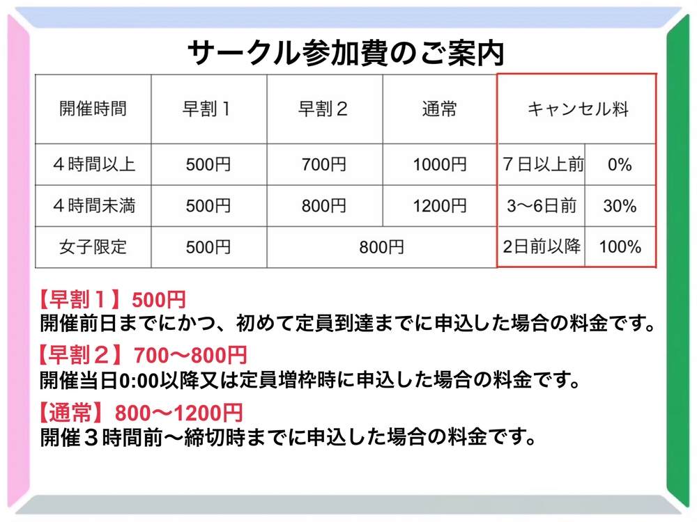もちろん短時間でサクッと交流するも楽しみ方の一つではあります。参加くださる方の流れを見込んでサークル参加費を適切な価格で回収するには、開催時間の長さに応じて種類の異なる料金体系を設ける方が良いと結論づけ、今回の設定に至っています。