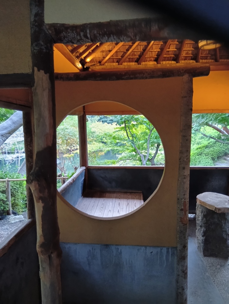 ↑池の周りの東屋の1つ。景色に溶け込む意図により、あえて壁を作らないとか。