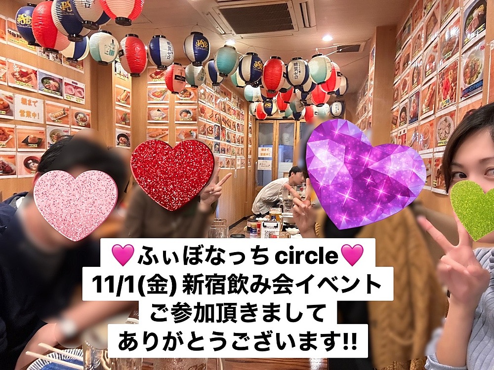 11月1日(華金)つなげーとで2回目の開催でした- ̗̀🎁 ̖́-新宿飲み会イベント♡♡♡今回は20代の若々しい方々にお集まり頂きました!!(*´▽`人)アリガトウ♡主催者MIKAKOは..学びの時間でした❣️❣️❣️とってもフレッシュ🩷趣味や職業が全然違うので、色んなお話を知る機会となりました🤍また学ばせてください!!笑そして楽しもうね🙈🩷次回横浜開催 11月3日(日)19:00〜21:00新宿開催 11月15日(金)19:00〜21:00