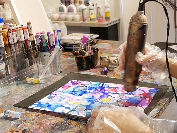 アルコールインクアートは絵が完成したらしっかり乾かし、土台作りもして、その場で持って帰れるみたいです☺️