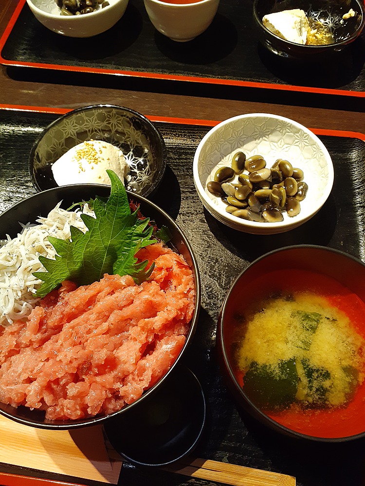 ②昼食会場(8名の奥まった席にて「中落ち丼」や「変わった枝豆?」の定食などを食べました。