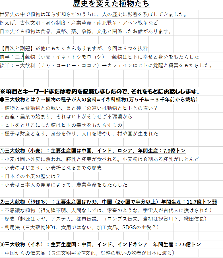 今回は三大穀物(小麦・トウモロコシ・イネ)と三大飲料(チャ・コーヒー・ココア)を取り上げました。