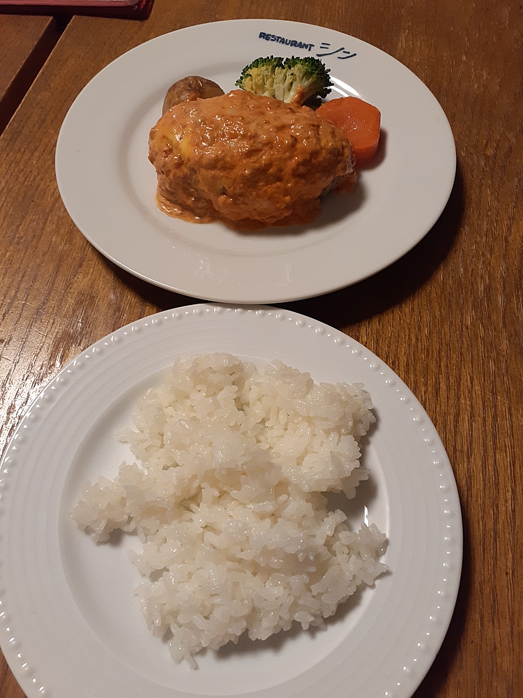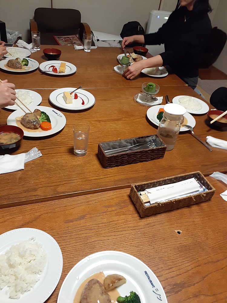 皆さんは名物のハンバーグ日本風を。主催者はローマ風を頼みました。