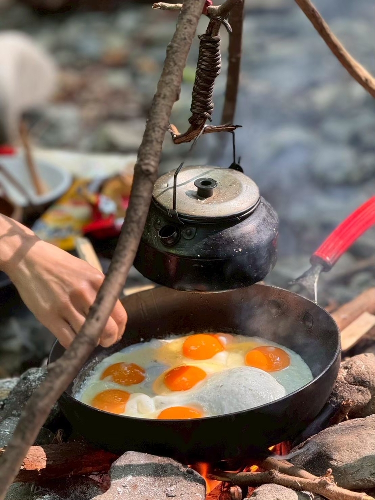 トライポットという枝を組み合わせて作る工作物にケトルを吊るしてお湯を沸かします。