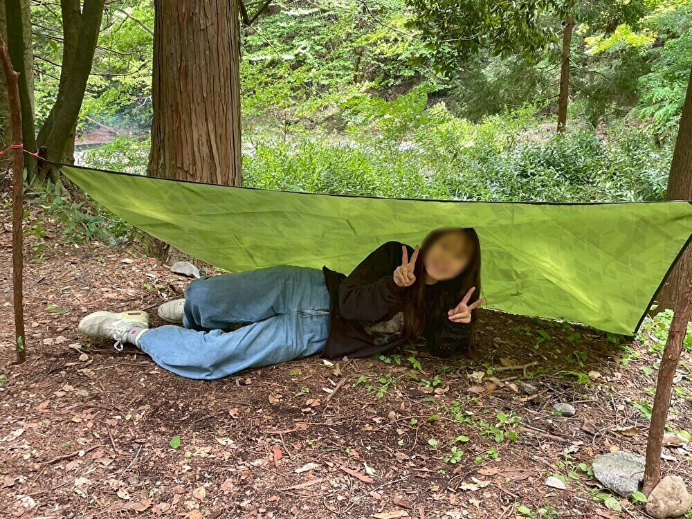 拾った枝、そしてロープとシートを活用したシェルターの作り方の勉強と。実践として、