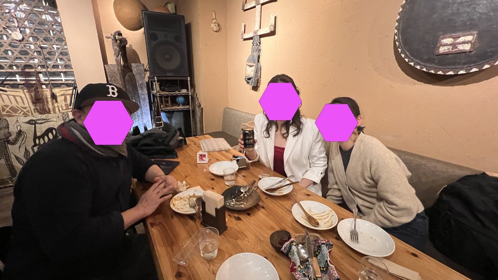 基本は生徒さん2名以上でないとグループは開催しないのですが(1名だと赤字になる値段設定なので)今日はそれぞれの予定があったので開催いつもはマクドナ⚪︎ドで開催するのが多いのですが生徒さんらの希望もあって初めてレストラン開催。まさかの田町のアフリカン料理というレア中のレアなお店で!