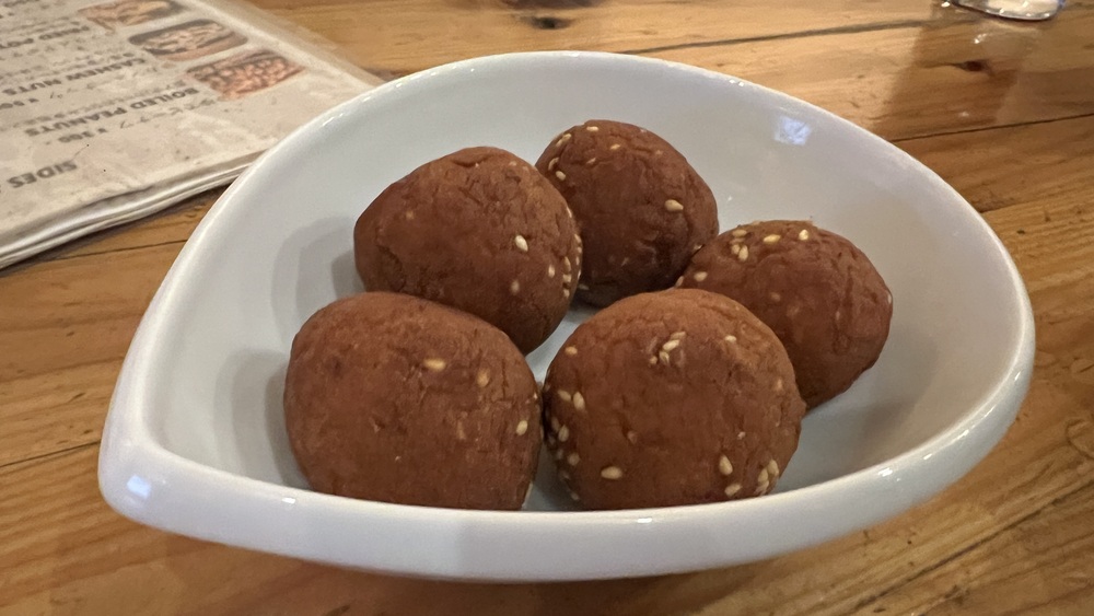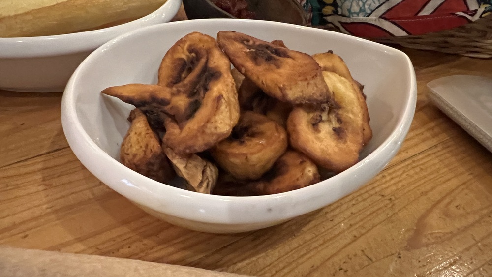 フライドポテトの中身は多分キャッサバ。いや、他の芋か。よくわからない。生徒さんの1人が持っていたクーポンで芋のボールのようなものが出てくる。硬いが中身はやはり芋。つけるソースもケチャップじゃないのでちょっと味も違ってくる