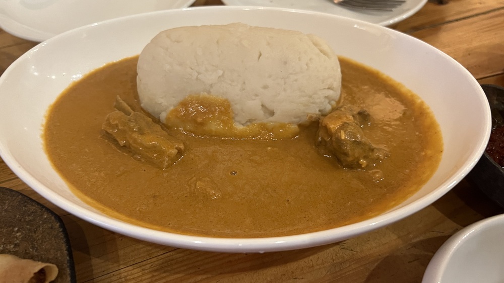 カレーっぽい見た目だったけれどもライスの代わりに目の前にあるのは巨大なマッシュポテトのような見た目のもの。実はライスの数倍の値段をするこちらのものはレアなようで・・。味は無いカレーもほぼ味が無い感じで、恐らく何かで味をつけるはず。いや、調味料みたいなものがテーブルの上には無いのでみんな少し混乱