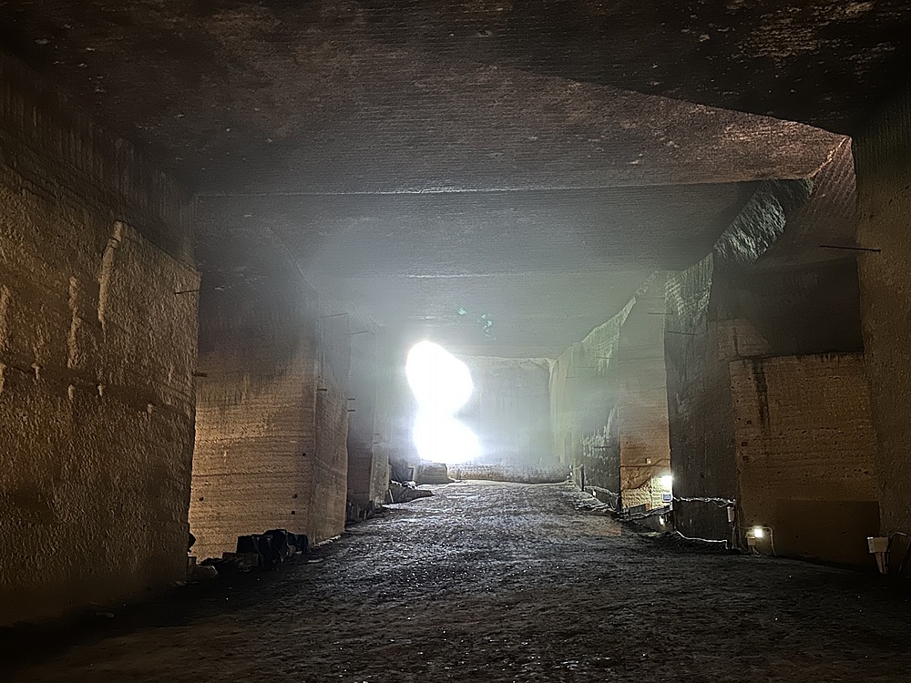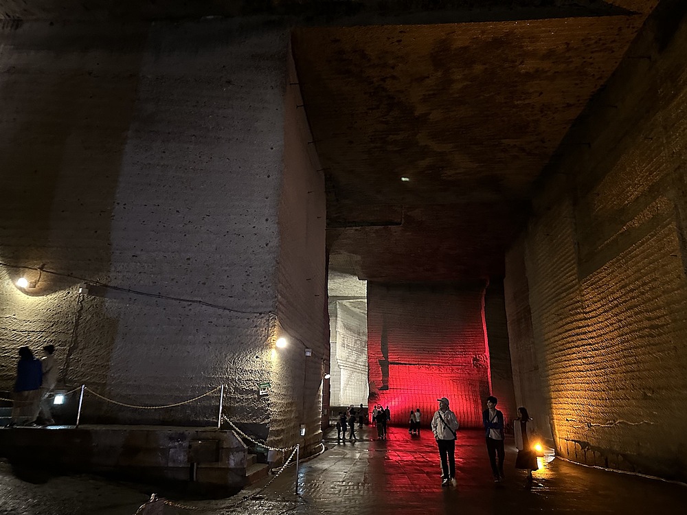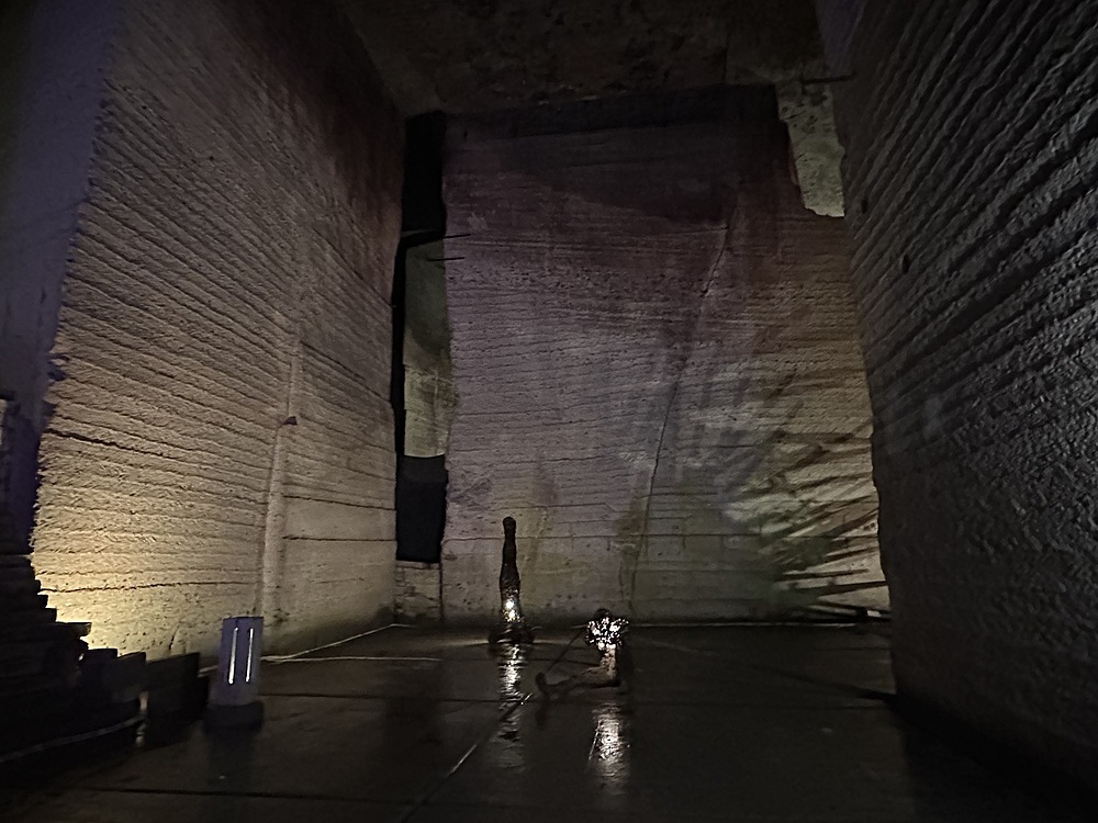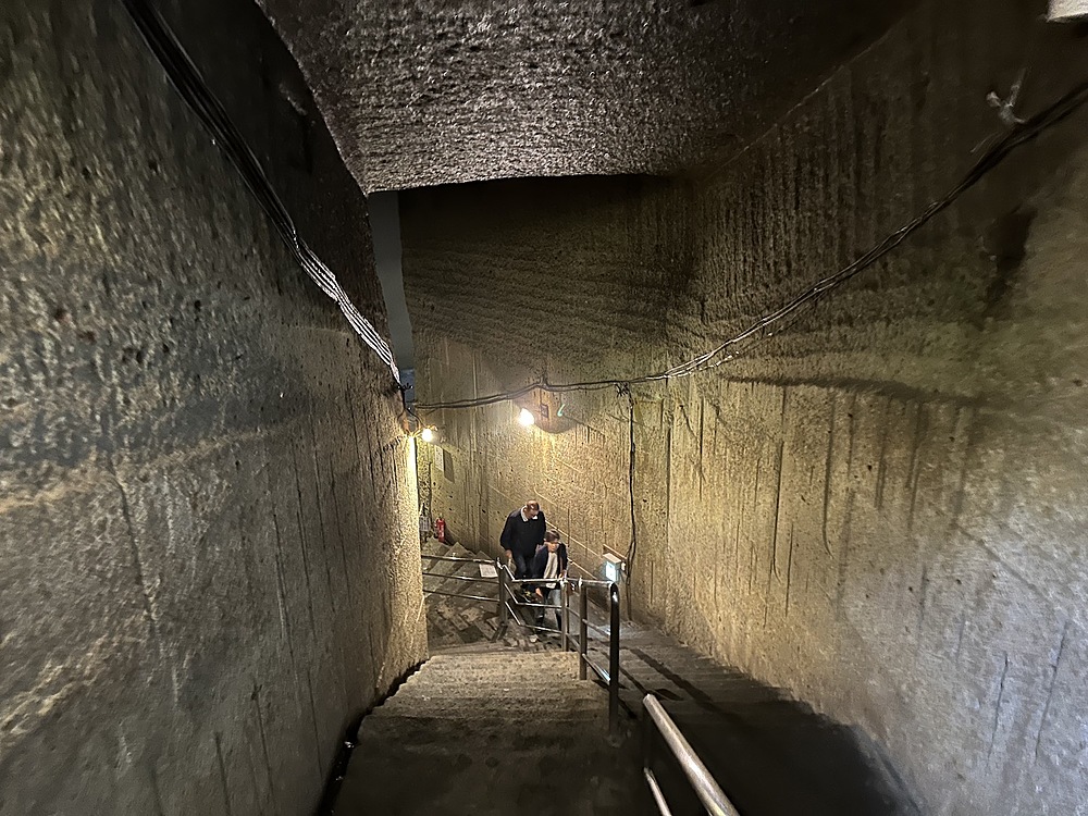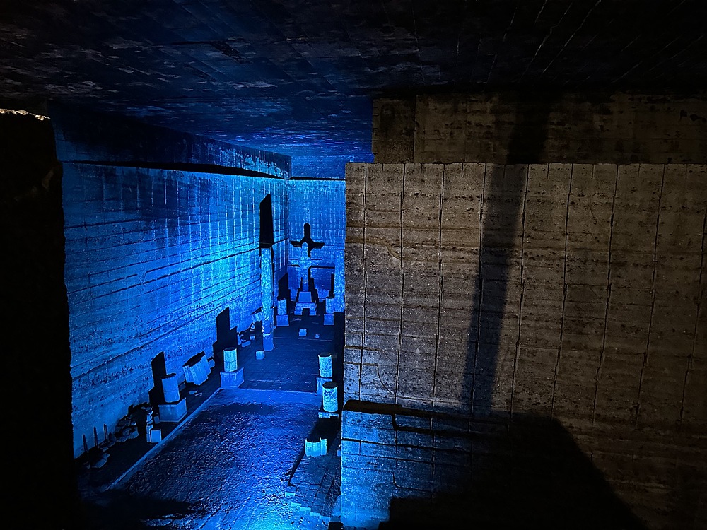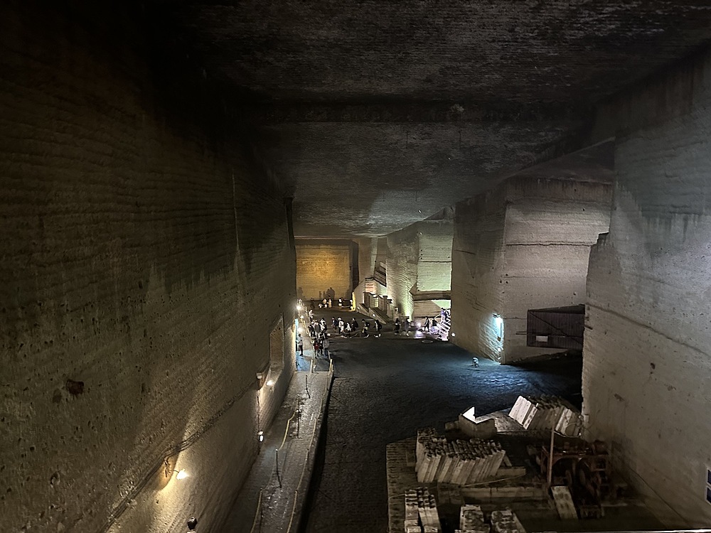 館内は当日は14度。冬は1度まで下がるようでひんやりしていました。人力で採掘する蝋人形が出てきたので、教育用の展示がされていると思いきや、広大な地下空間はほとんどがアート空間として利用されていました。ところどころでドラマやアーティストが利用したというふだがかけられていました。横穴(歩けない)は軍事施設として利用されていたということでした。