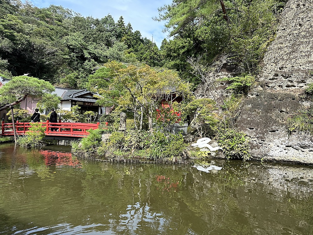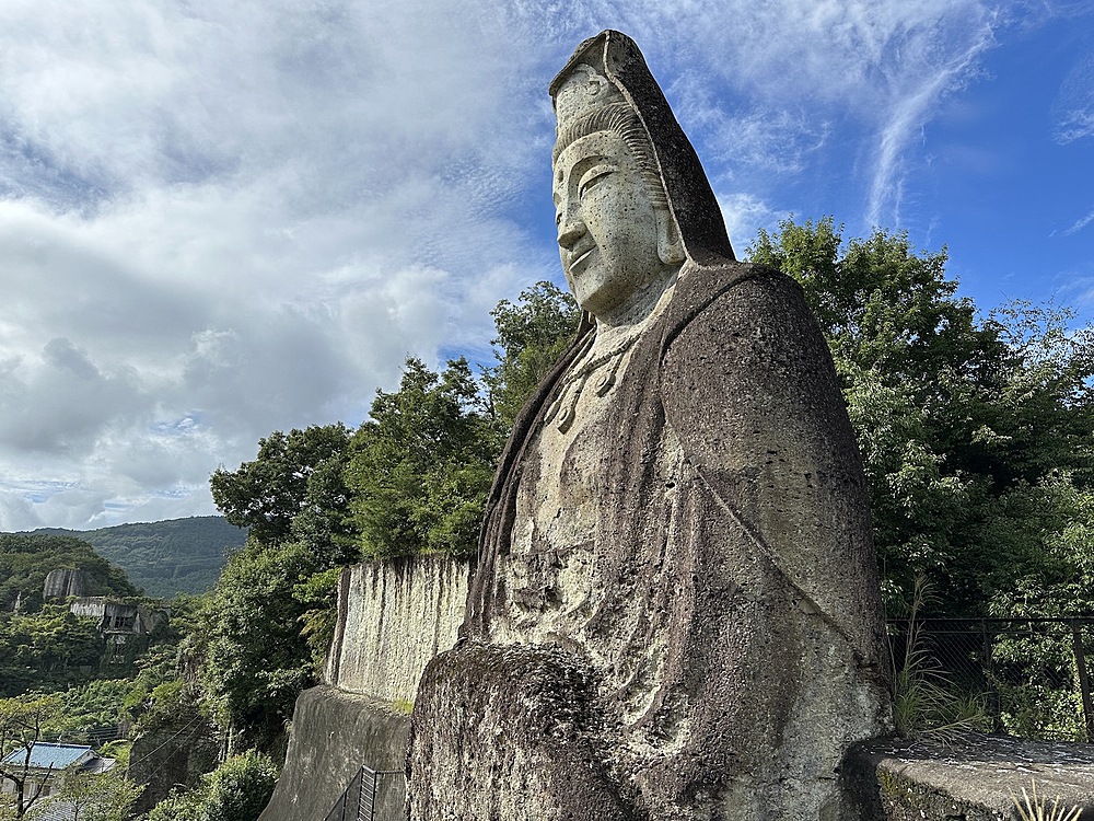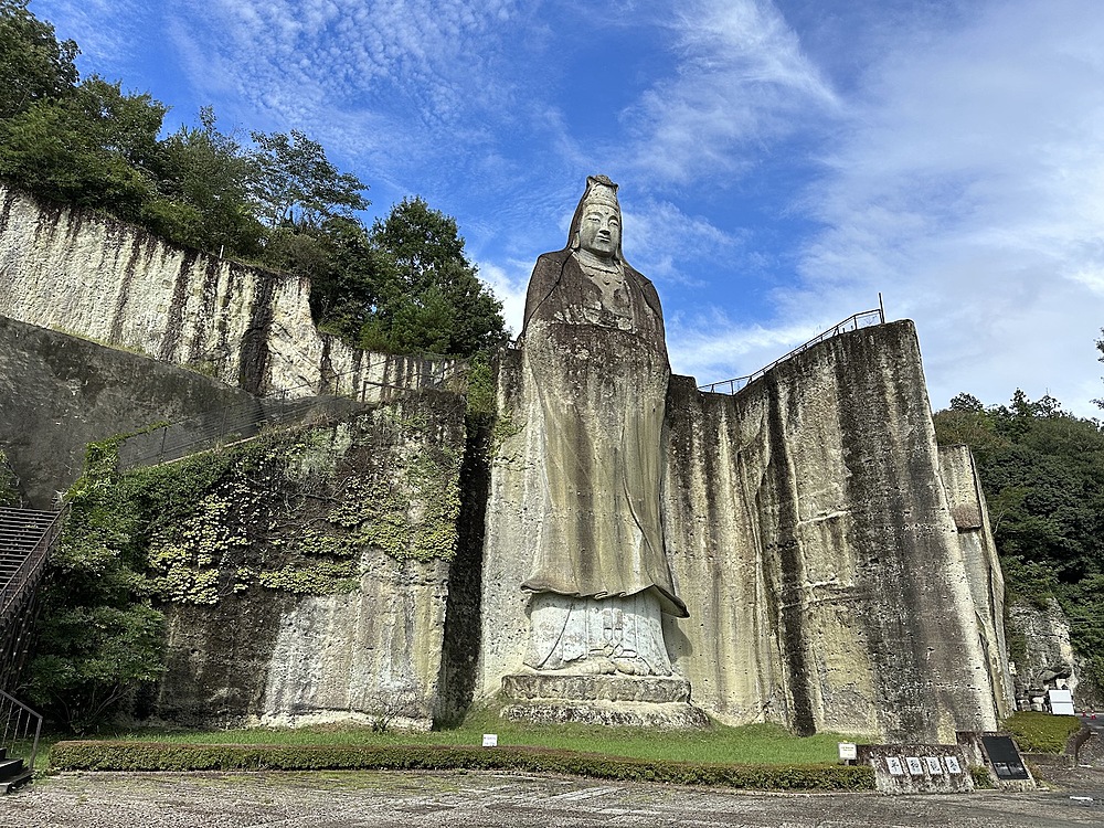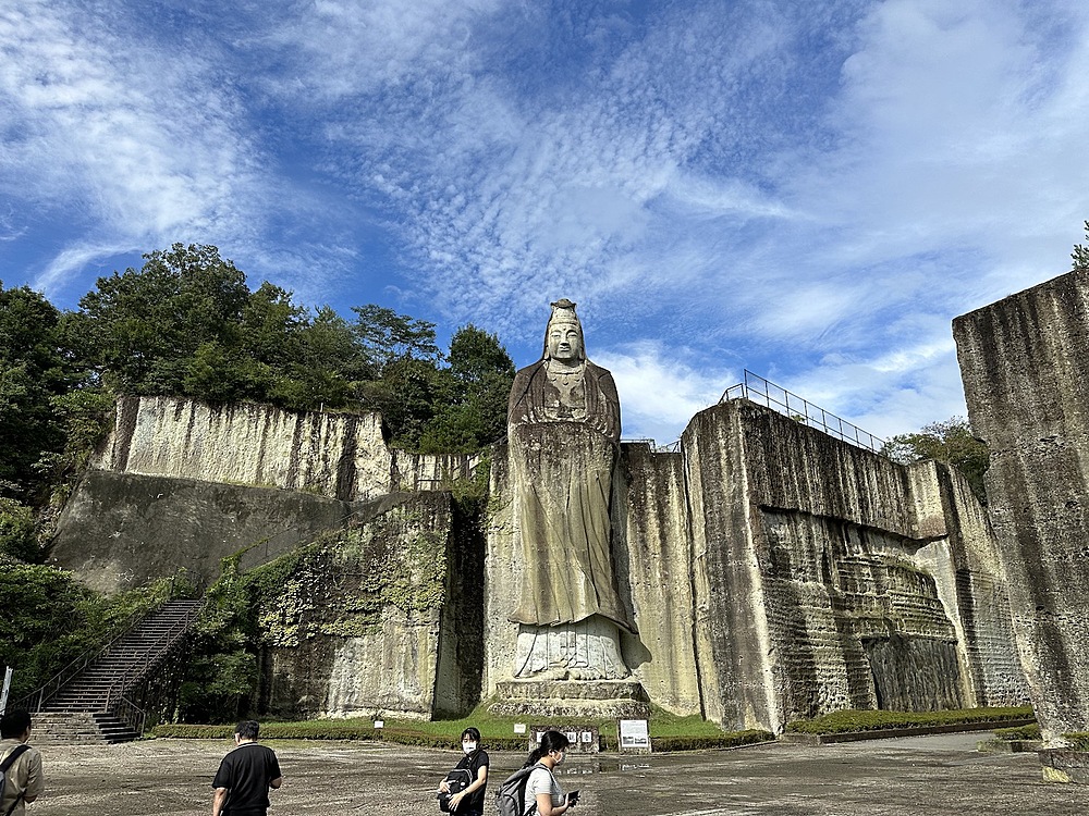 平安時代に掘られたという千手観音のある大谷寺に行き、日本最古の石仏「大谷観音」を見たり、27mの「平和観音」を見たりしました。大谷観音は撮影不可でした。平和観音は石仏と目が合うというパワースポットを教えてもらい、皆で行きました。