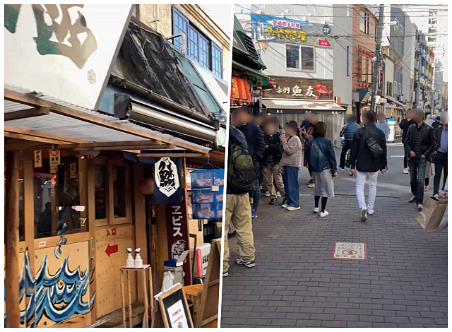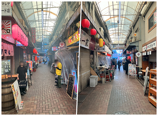 ここは赤羽一番街商店街内の赤羽シルクロードというアーケード街、昼間からお店が開いているので呼び込みの店員さんも店頭に立っています。