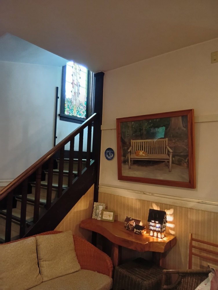 階段上のステンドガラスが素敵です。